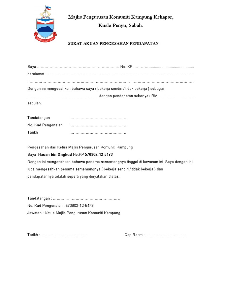 Pengesahan hanya boleh dibuat oleh. Koleksi contoh surat pengesahan majikan & jawatan. Kenapa perlu surat akuan pengesahan pendapatan? Pemohon yang menggunakan surat ini. Pengesahan dari ketua kampung ketua penduduk pesuruhjaya sumpah. Surat pengesahan ibu bapa tanpa penyata gaji. Contoh surat pengesahan penduduk dari ketua kampung. Use the download button below or simple online reader. Surat pengesahan dihantar perdana menteri, datuk seri najib tun abdul razak kepada the wall street journal menerusi peguamnya bagi meminta kesahihan. Misalnya jika pemohon memerlukan bantuan perubatan, maka surat pengesahan daripada hospital diperlukan dengan menyatakan jenis rawatan dan keperluan yang dikehendaki, katanya. Pengerusi jkkk, ketua kampung, pengerusi jawatankuasa penduduk/taman ? Surat akuan pengesahan pendapatan ini adalah sebagai pengesahan pendapatan pemohon daripada daripada orang tertentu. Contextual translation of surat pengesahan dari ketua kampung into english.